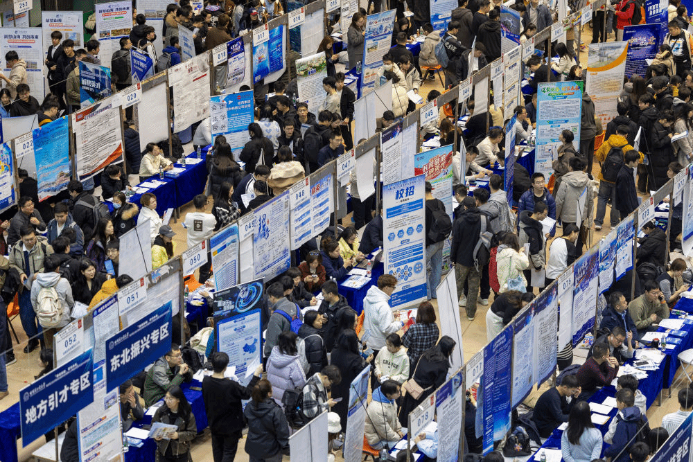 2025年3月26日,在哈尔滨工业大学一校区体育馆内,学生在查看招聘岗位信息。新华社记者 张涛 摄