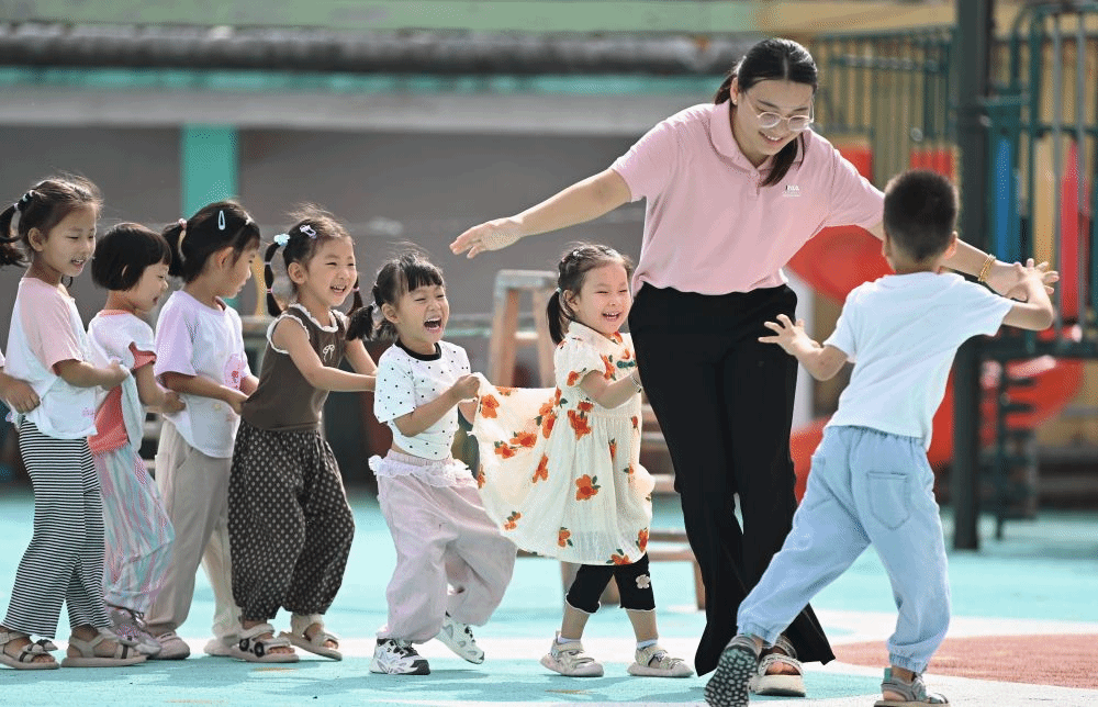 2025年9月10日,在山东省滕州市西岗镇中心幼儿园(柴里)分园,老师和小朋友一起玩“老鹰捉小鸡”趣味游戏。新华社发(李志军 摄)