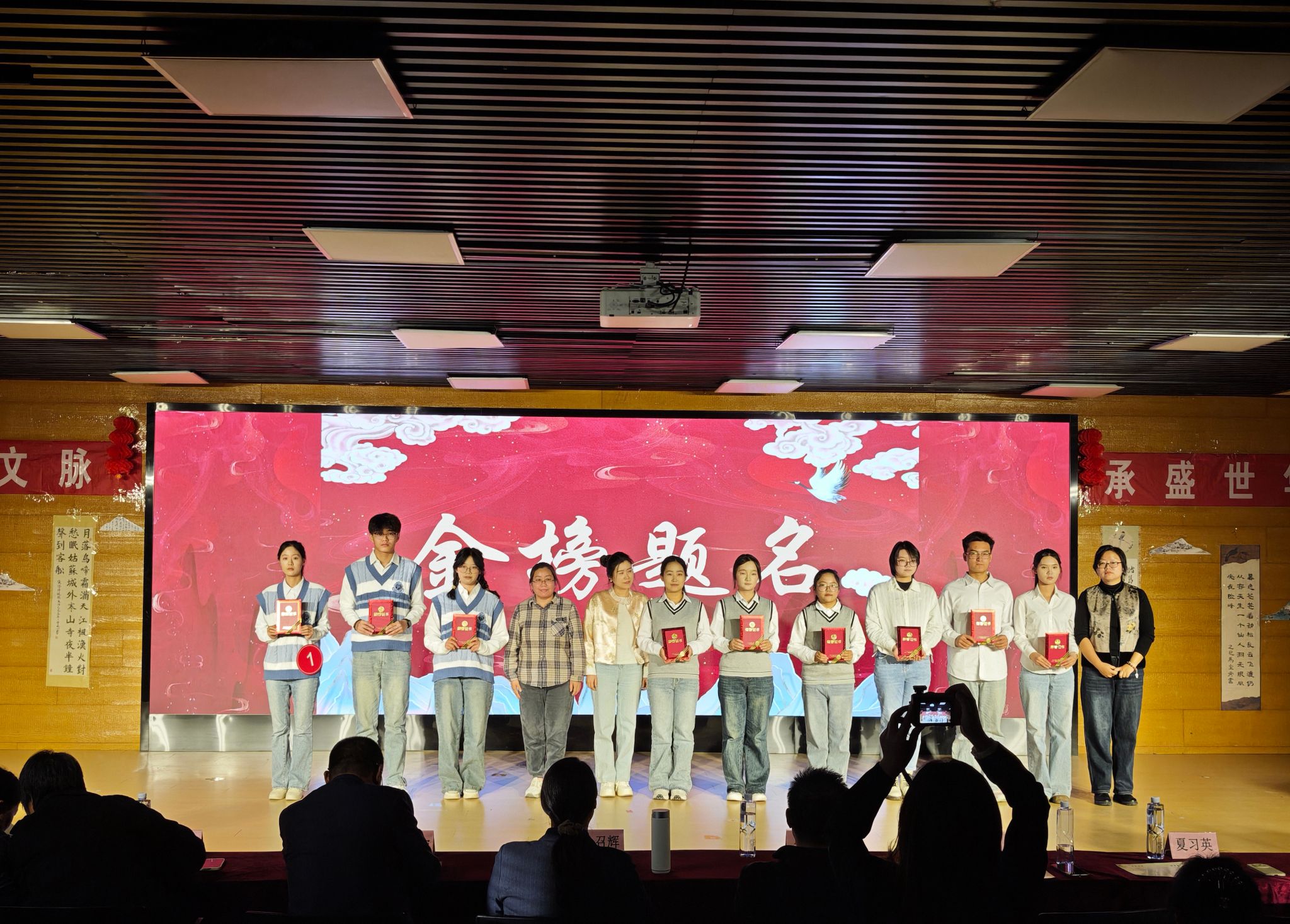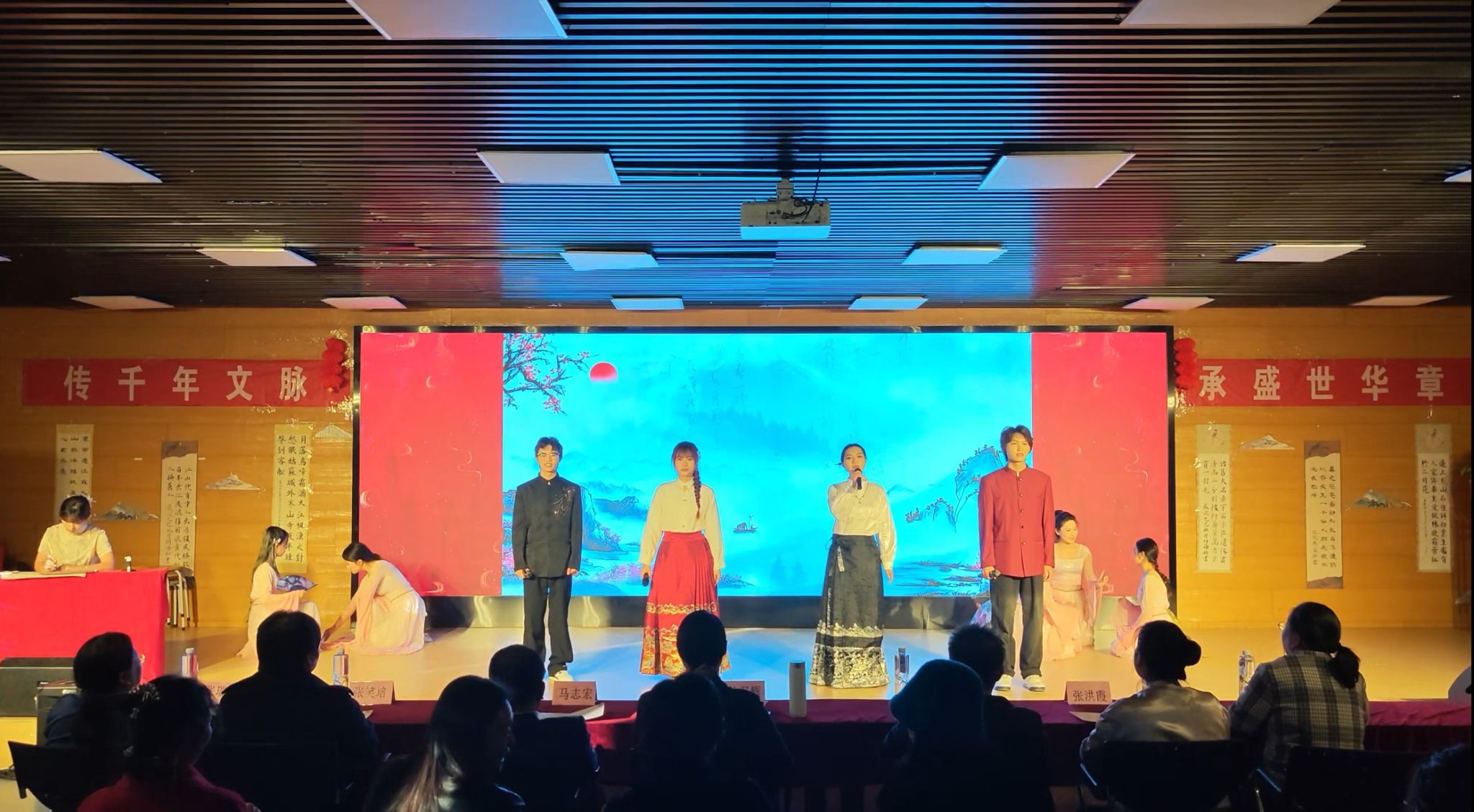 决赛上,人文学院党委副书记杜召辉致开幕词,人文学院副院长朱伟致闭幕词。参赛选手通过“有问必答,众志成城,飞花令”三个环节进行答题,选手们充分展现了他们对传统文化知识的深厚积累和独到见解,体现了当代大学生的文化素养。最终2025级文化产业管理专业“文化乘风队”以110分荣获冠军。