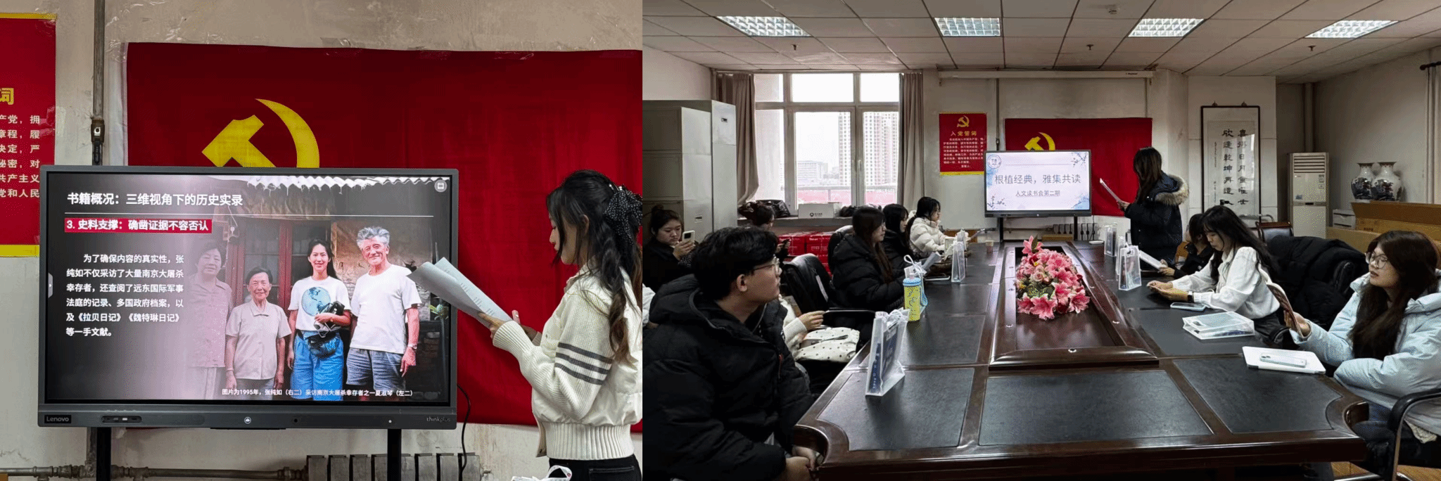 12月12日下午,学院在敏学楼 602 成功举办了“根植经典,雅集共读”读书分享会第二期。本期活动聚焦历史与人文精神的传承,23级英语专业的李飒飒同学为在场师生分享了《南京大屠杀》一书的阅读感悟。她以沉重而清晰的讲述还原了那段不容忘却的历史真相,强调铭记不是为了延续仇恨,而是为了守护真实、珍爱和平。