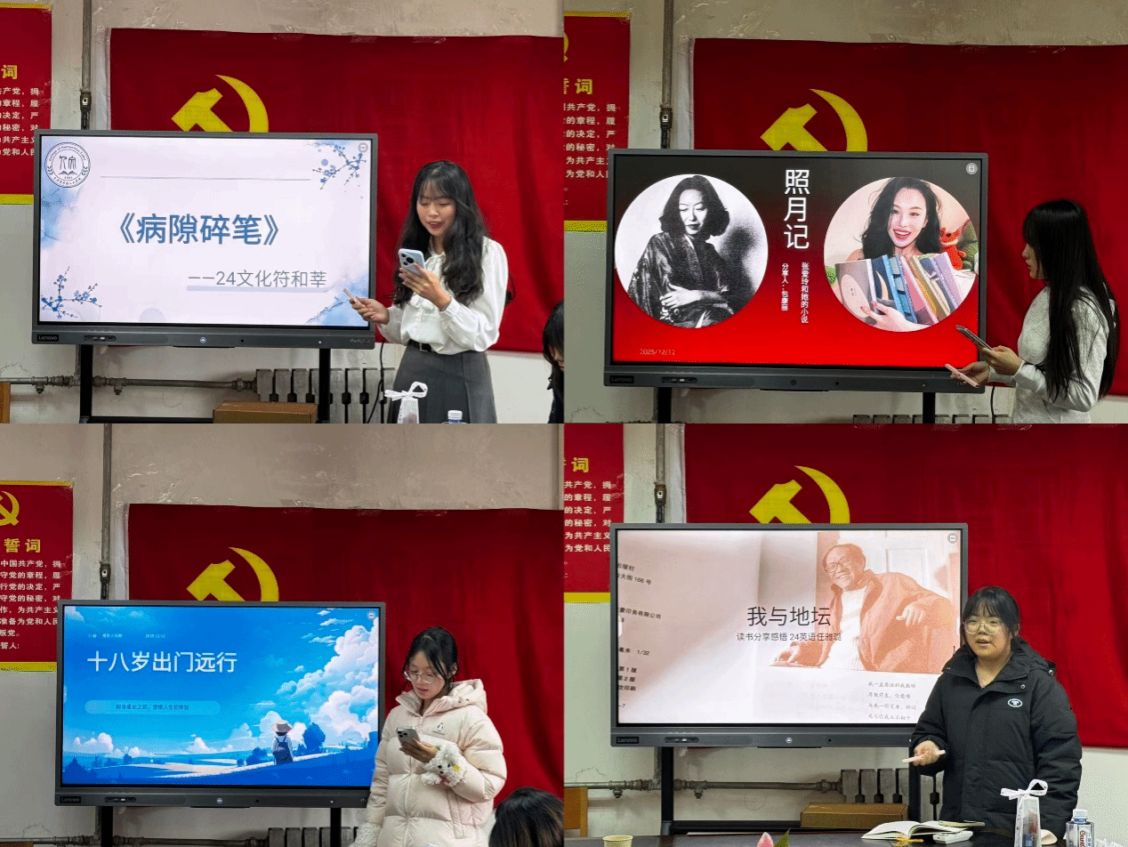 12月5日,首期分享会在敏学楼一楼会议室开启,围绕家国情怀、人生哲思与文学探索三大主题展开。学子们分别解读《重读抗战家书》《觉醒年代》《南京!南京!》等著作,传递爱国热忱与历史敬畏;通过《活着》《平凡的世界》剖析生命韧性与平凡价值,借《革命文学》《我和我的祖国》阐释文学与现实的紧密联结。