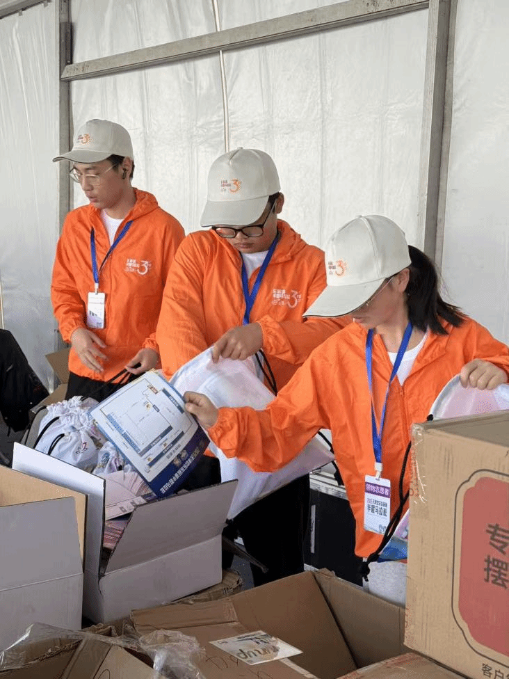 服务期间,志愿者们准时到岗、各司其职、默契配合。小票打印组认真核验选手身份、完成人脸识别,快速准确打印领物小票;号码布发放组仔细核对参赛号码,规范佩戴手环,高效完成发放;物资整理与补给组提前分装参赛物资、及时补充物料,将背包、服装等物品有序打包;咨询、芯片检测与指引组耐心答疑、细心检测、清晰引导,维持现场秩序;氛围组以热情活力营造热烈有序的现场氛围,为选手加油鼓劲。
