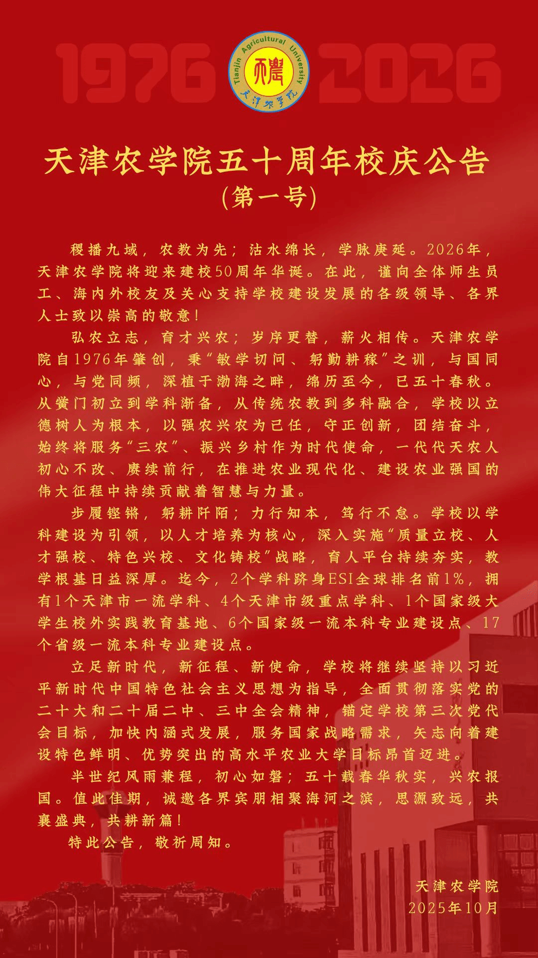 天津农学院五十周年校庆公告(第一号)